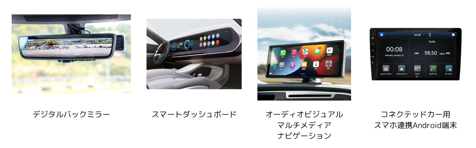 そのためには、センシング技術や組込みAI技術を活用、そしてスマートフォン連携、とくにAndroid端末のプラットフォームを準備し、コネクテッドカーサービス対応など、多岐にわたる固有の要素技術とそれを組み合わせるシステム技術が重要です。