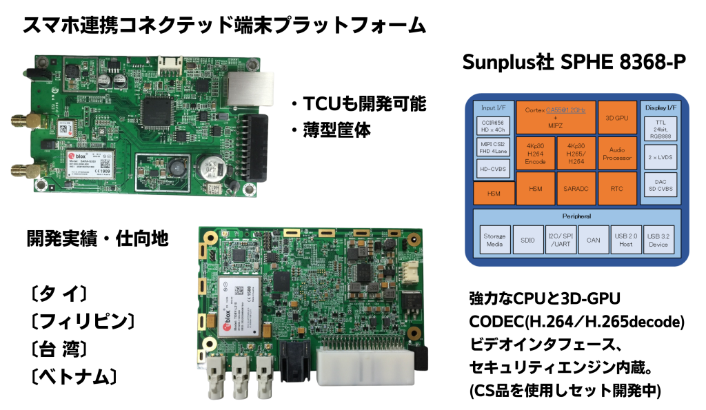 弊社では、車載Linux及びAndroidに対応した、NXP、Qualcomm、Sunplusなど世界の有力デバイスを使いこなしています。特に、アジアでは標準的になっているスマートフォン連携やコネクテッドカーサービス対応について、Android端末のプラットフォームを準備しています。